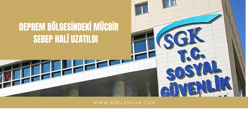 Sosyal Güvenlik Kurumu tarafından 30/04/2024 tarihinde yapılan Duyuru ile; Adıyaman, Hatay, Kahramanmaraş ve Malatya illeri ile Gaziantep ili İslâhiye ve Nurdağı ilçelerinde 30/4/2024 günü sonu itibarıyla sona erecek olan mücbir sebep hali 31/8/2024 tarihine kadar uzatılmıştır.