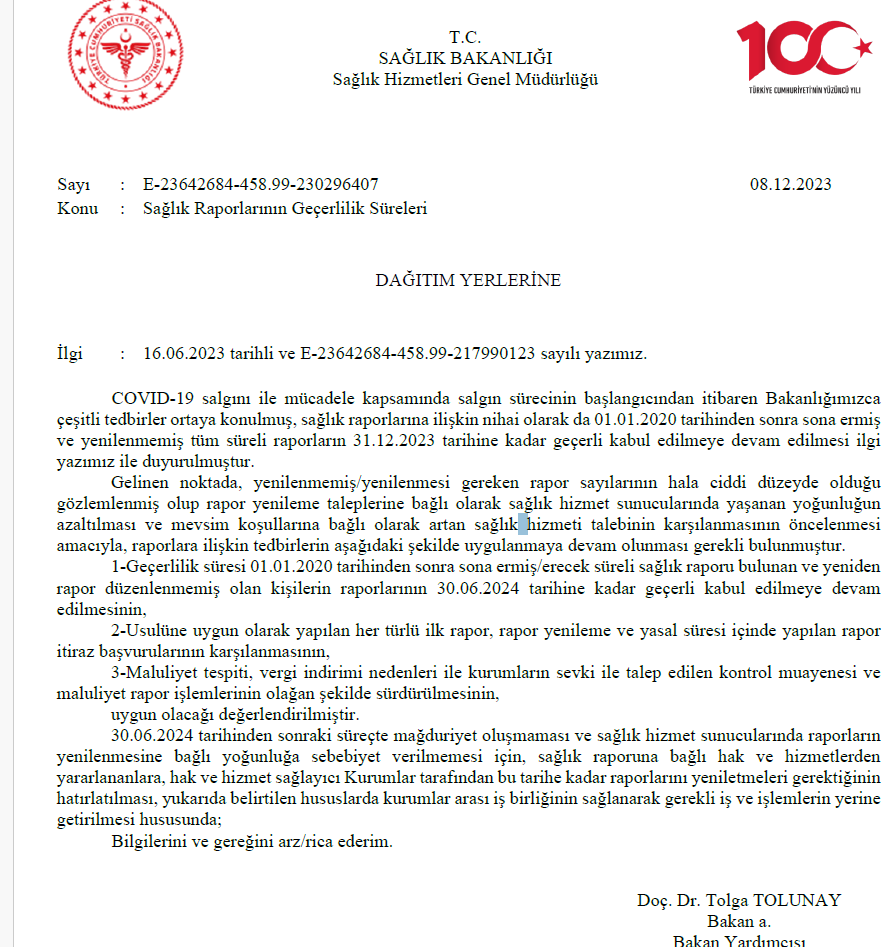 1-Geçerlilik süresi 01.01.2020 tarihinden sonra sona ermiş/erecek süreli sağlık raporu bulunan ve yeniden rapor düzenlenmemiş olan kişilerin raporlarının 30.06.2024 tarihine kadar geçerli kabul edilmeye devam edilmesinin,